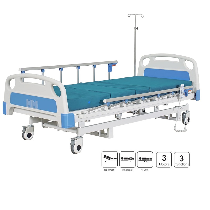 SMI-202 Series 3 Functions Electric ICU beds are Equipped with 3 motor actuator system, this bed is designed and built integrating state-of-the-art technologies to enhance the patient’s comfort and improve caregiver’s efficiency. Its outstanding performance is complemented by its ergonomic features and best-in-class quality, Specially Designed for Clinics & Nursing homes who requires the Economy & Affordability both together with the Functionality. These are mounted with 2pc collapsible safety side rails ensuring convenience & Safety for the patients and comes with a hand held remote control unit.