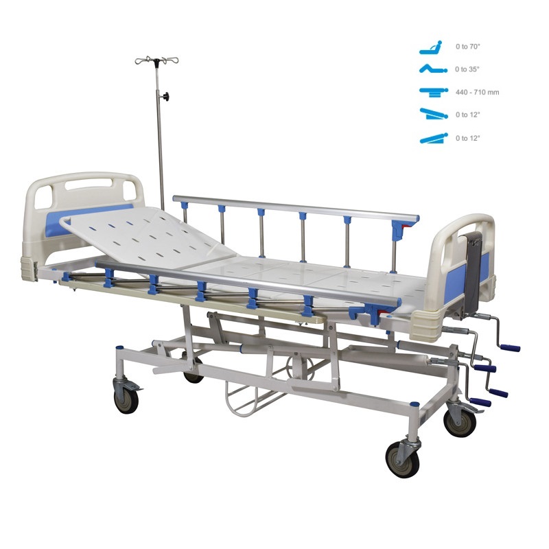 SMI-103 Series is the adjustable manual 5 function hospital bed designed to deliver best quality and safety at an affordable price, these ICU Beds has mechanical setup that is packed with the full set of clinical positions like Height, Backrest, Knee rest, Trendelenburg, Reverse Trendelenburg positions on individual ultra-smooth crank mechanism, these ICU beds are beneficial to clinics, nursing homes, and hospitals. Comes with 2pc Collapsible Safety Side rails that helps to secure the patient and also enhance the overall comfort. These bed is mounted on synthetic wheels for easy mobility during any emergency.