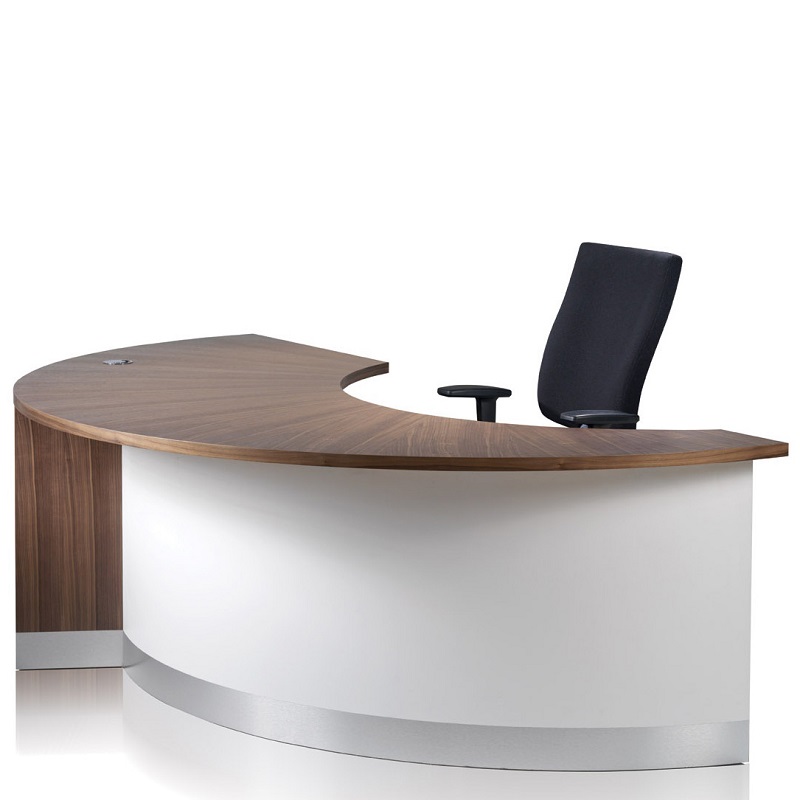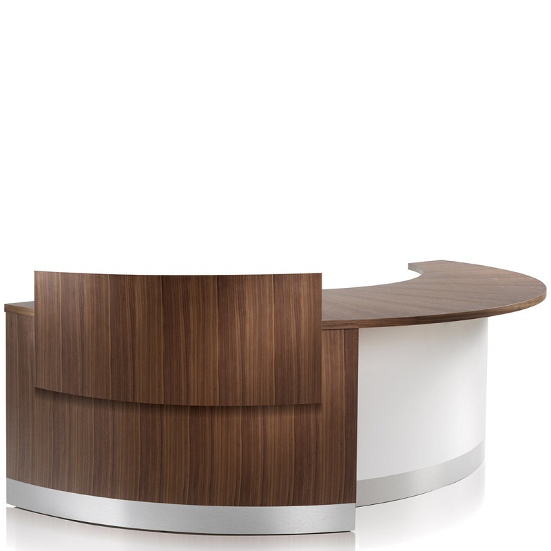 Scimed Curvo is a contemporary reception desk finished in a combination of solid white and walnut oak laminate. Designed with elements of solid wood, its sleek and trendy looks make it a perfect choice for modern offices. This space saving front desk also includes a storage pedestal with lock for added convenience and functionality. Suitable for seating one to two person, built with top grade raw materials for lasting durability, natural feel and luxurious looks. In addition to the pictured Walnut color, this master piece can also be created with alternative woods include Oak and Dark Oak, together with Natural Cherry and dark Cherry shades.Where there is scope to extend the reception facilities, the modular format of Curvo enables units to be built up to form an impressive focal point for visitors entering the reception area.